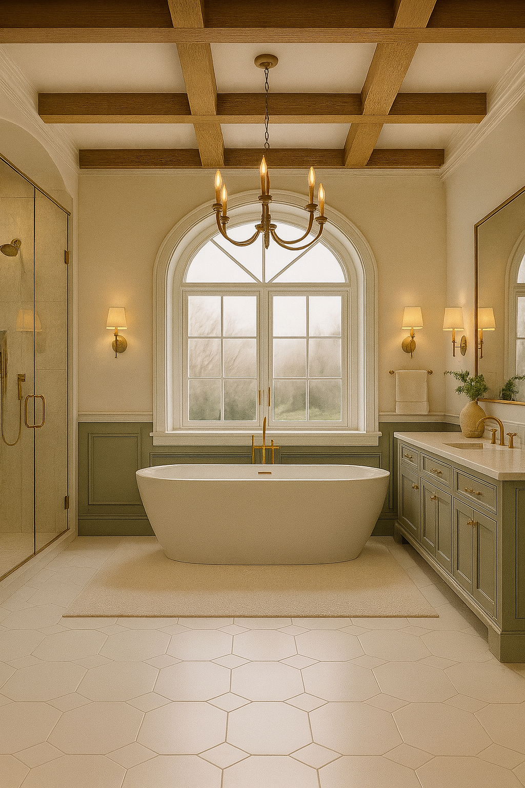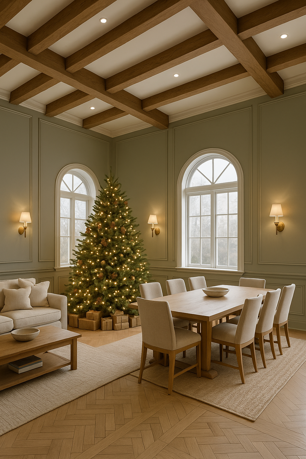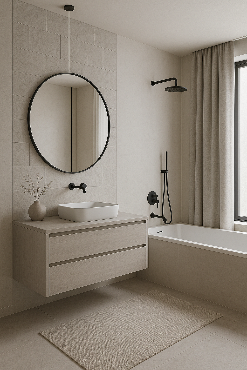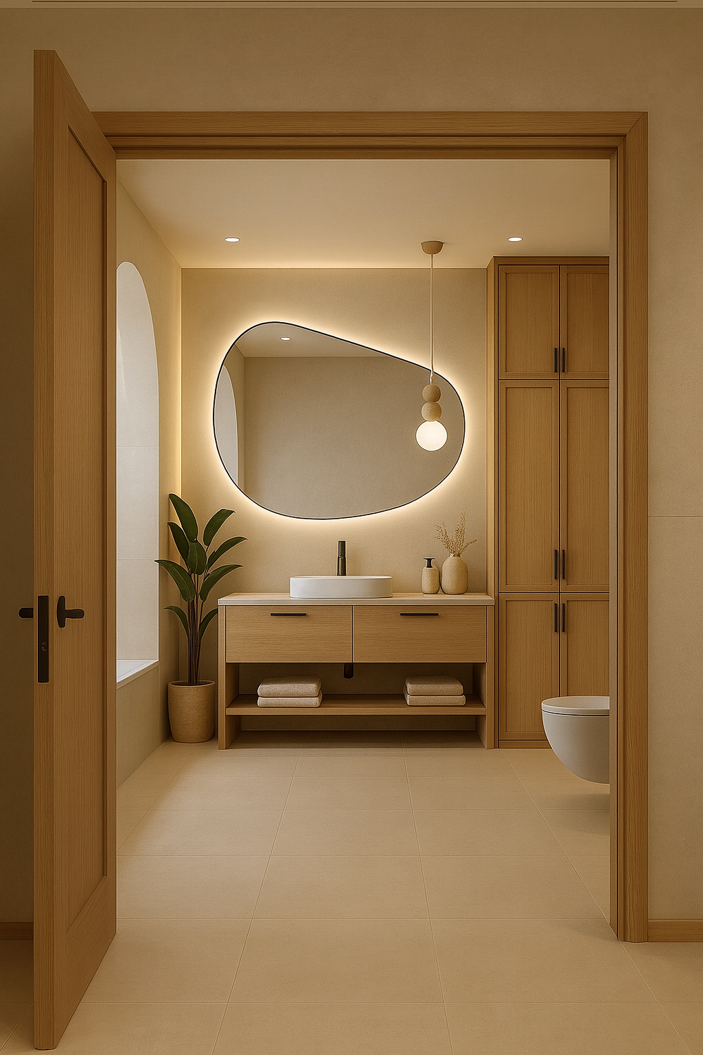 Na tej podstawie tworzę wizję, która łączy funkcjonalność z wyjątkową estetyką: naturalne światło, ciepłe beże, drewno i spokojną symetrię.